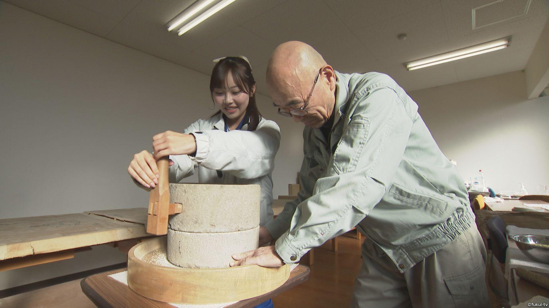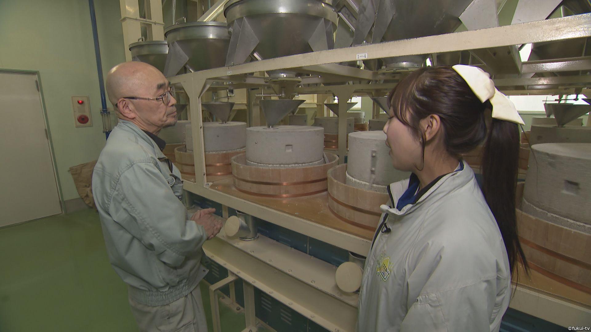 福井市の斉藤製粉所は、21台の石臼を使ってそば粉を挽いています。石臼挽きは香りや粘りを引き出す効果があり、戦前から使われている石臼も現役です。これらの石臼の多くは福井市美山地区の「小和清水」の石で作られていて、福井県内の製粉所で使われている石臼のほとんどは、小和清水産の石臼なんだとか。