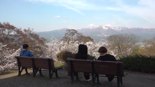 天守から望む残雪の荒島岳とサクラの競演 越前大野城で300本が去年より1週間早く満開に 福井